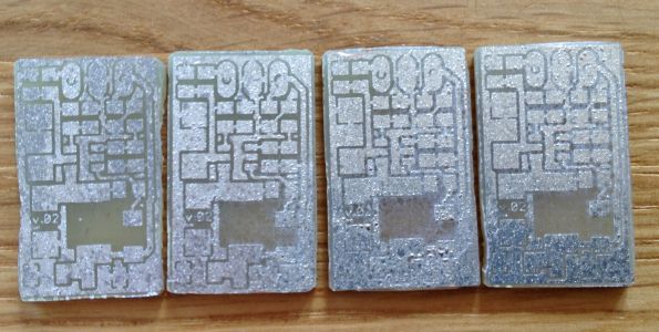 Ich habe gleich 4 Platinen gemacht, da der schmale Streifen eh nicht mehr für etwas anderes zu gebrauchen ist. Mit dem umgebauten Laminierer das Layout aufgebracht in meiner Eigenbau-Küvette geätzt und anschließend mit der Heißluftpistole und Fittingpaste verzinnt