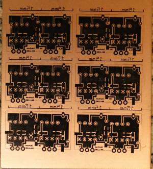 Leiterplatte vor dem ätzen. Die Beschichtung wurde durch meinen umgebauten Laminierer aufgebracht. (Siehe Laminatorumbau für Leiterplatten)